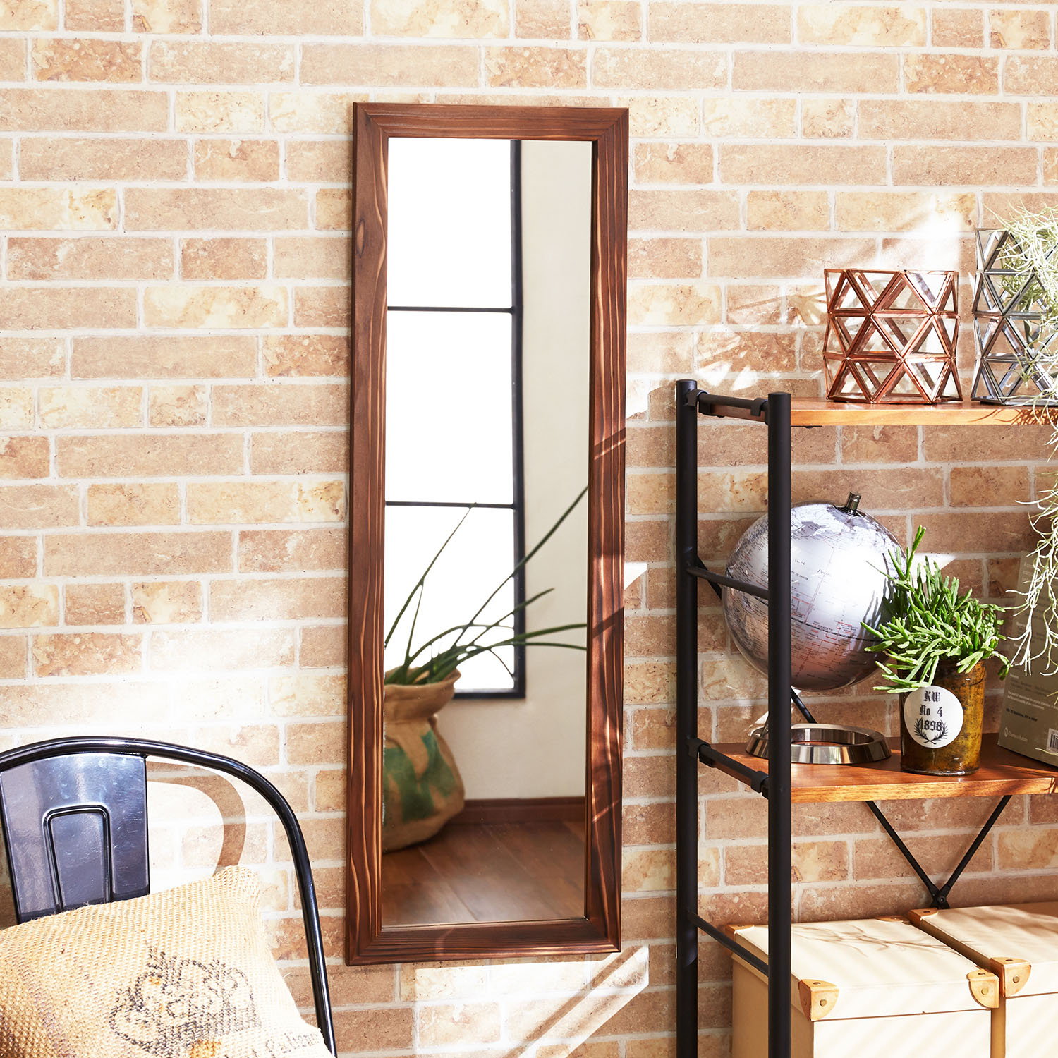 【ベルメゾン】杉材ウォールミラー 焼き付けでしっかりと存在感のある色合いに仕上げ、和モダンや男前インテリアにも合うデザインに仕上げました。縦長のスッキリとしたフォルムはコンパクトめだから、玄関やリビング、寝室などお好きな場所に設置しやすいのが魅力。 税込 6,990円 |
