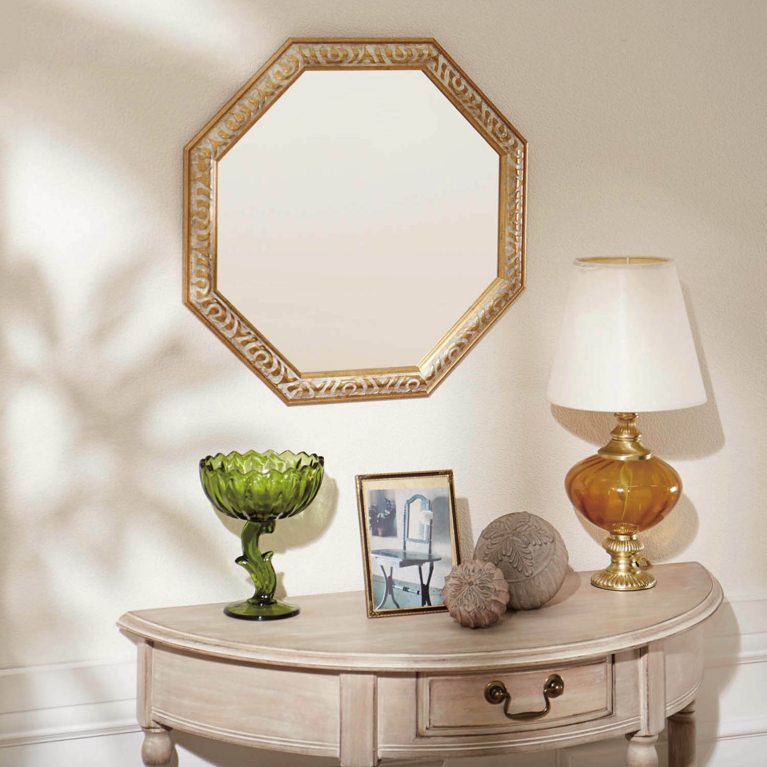 【ベルメゾン】アンティーク調八角鏡 縁起が良いとされる八角形のミラー。飾り彫りを施したようなアンティーク調の凝ったデザインは、玄関やお部屋を格調高くおしゃれに演出してくれます。艶を消した大人っぽいカラーリングも素敵。 税込 5,990〜7,990円 |