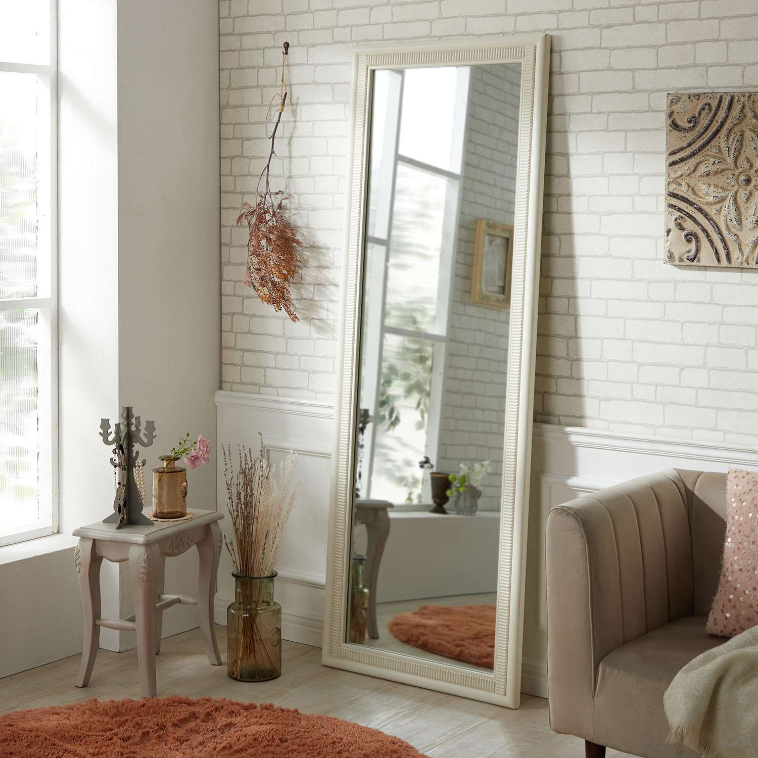 【ベルメゾン】アンティーク調ホワイトの窓枠ウォールミラー 壁に飾るだけで、空間をワンランクアップしてくれるアンティーク調ミラー。シャビーシックな窓枠フレームで、表情感のあるデザインに仕上げています。身体をしっかりと映せるから使い勝手も抜群。 税込 18,480円 |