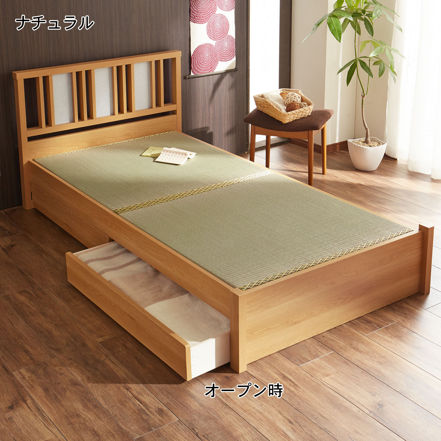 | ) | 【ベルメゾン】引出し収納付き畳ベッド(シングル/セミダブル/ダブル) い草の香りと畳ならではの適度な弾力が魅力。フスマ風デザインのヘッドボードも和の雰囲気を後押ししてくれます。衣類やシーツをたっぷり収納できる大きめの引出しが2杯付いているので、収納のないお部屋にも重宝。 税込 44,900〜55,900円 |