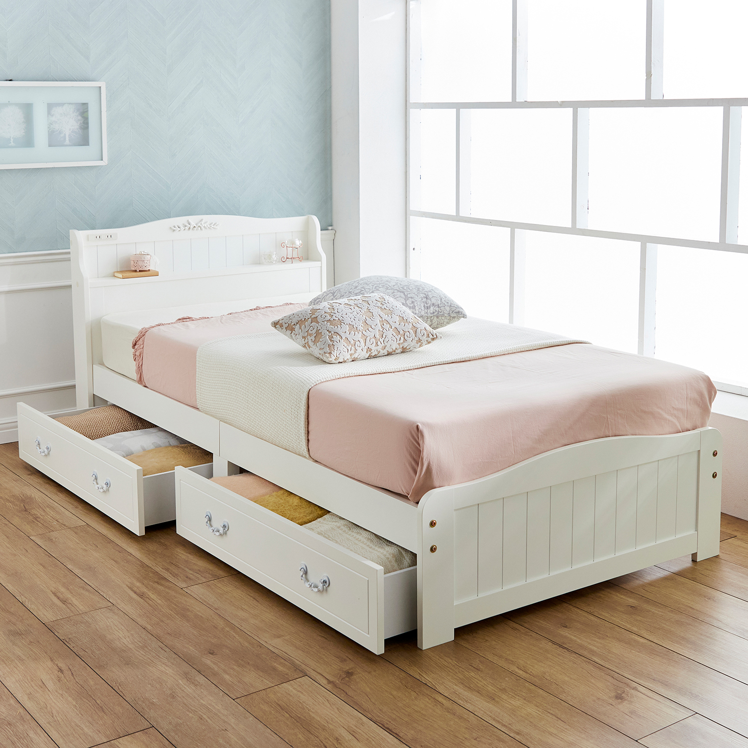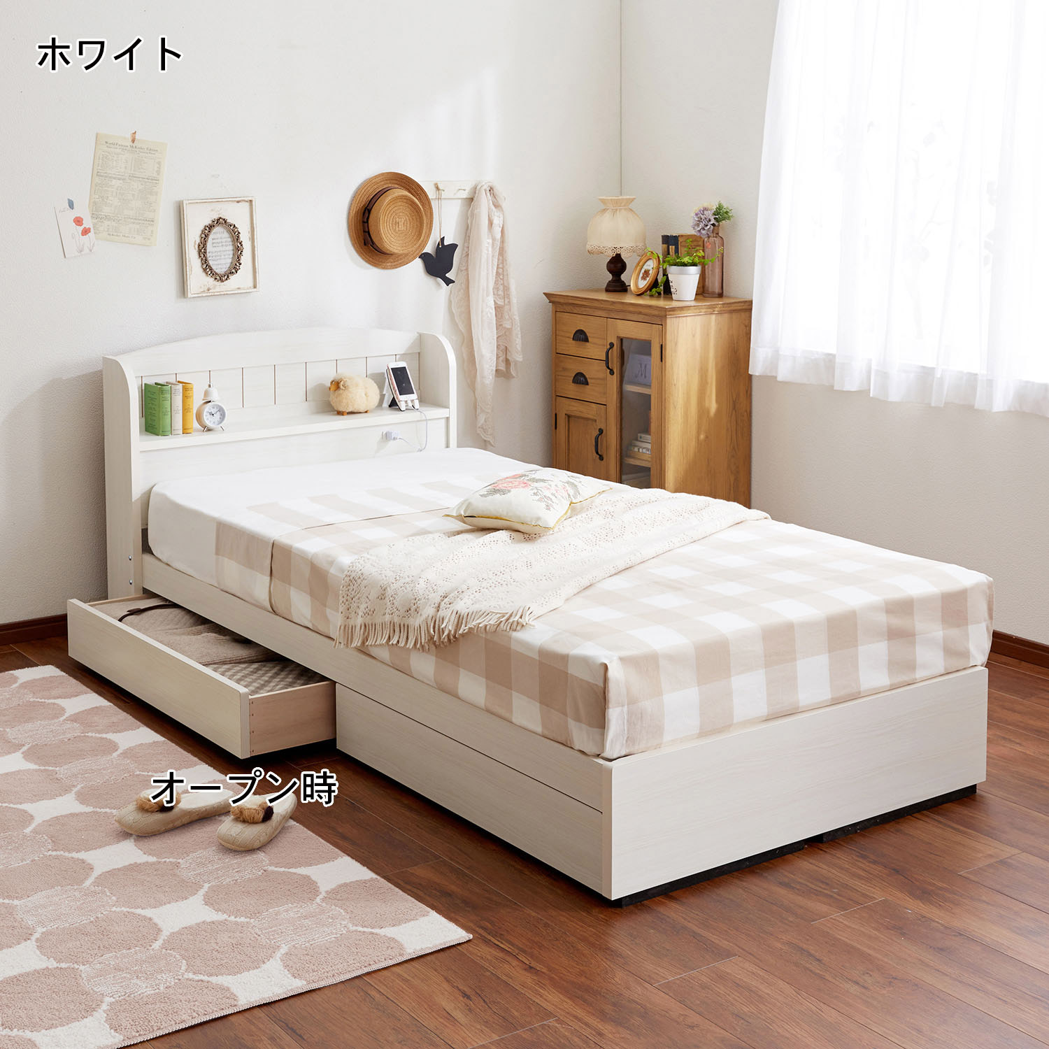 | ) | 【ベルメゾン】選べるマットレス付きコンセント・収納付きベッド(シングル/セミダブル/ダブル) 女の子らしい雰囲気のナチュラルなベッド。ヘッドボードに羽目板風のデザインを施しました。宮部は棚形状になっています。スマートフォンの充電にも便利なコンセント付き。衣類やタオルを収納できる2杯の引出しは、収納スペースの少ない寝室でも重宝します。 税込 50,900〜73,900円 |