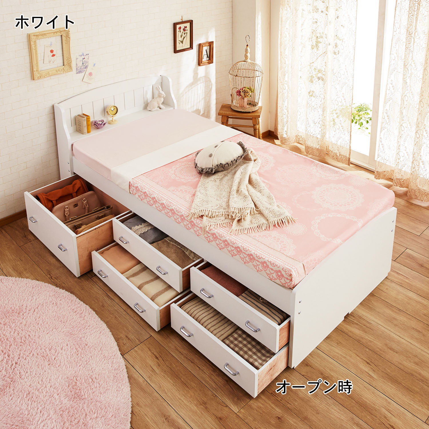 | ) | 【ベルメゾン】エレガントモチーフの引出し付きベッド(シングル/セミダブル) 収納スペースの少ないお部屋に嬉しい引出し収納付き。引出しはベッドの左右どちらでも使えます。スマホや時計、保湿クリームなど就寝時に必要な小物を置ける宮付き。優れた通気性で、一年中快適に眠れるすのこベッド。 税込 44,900〜49,900円 |