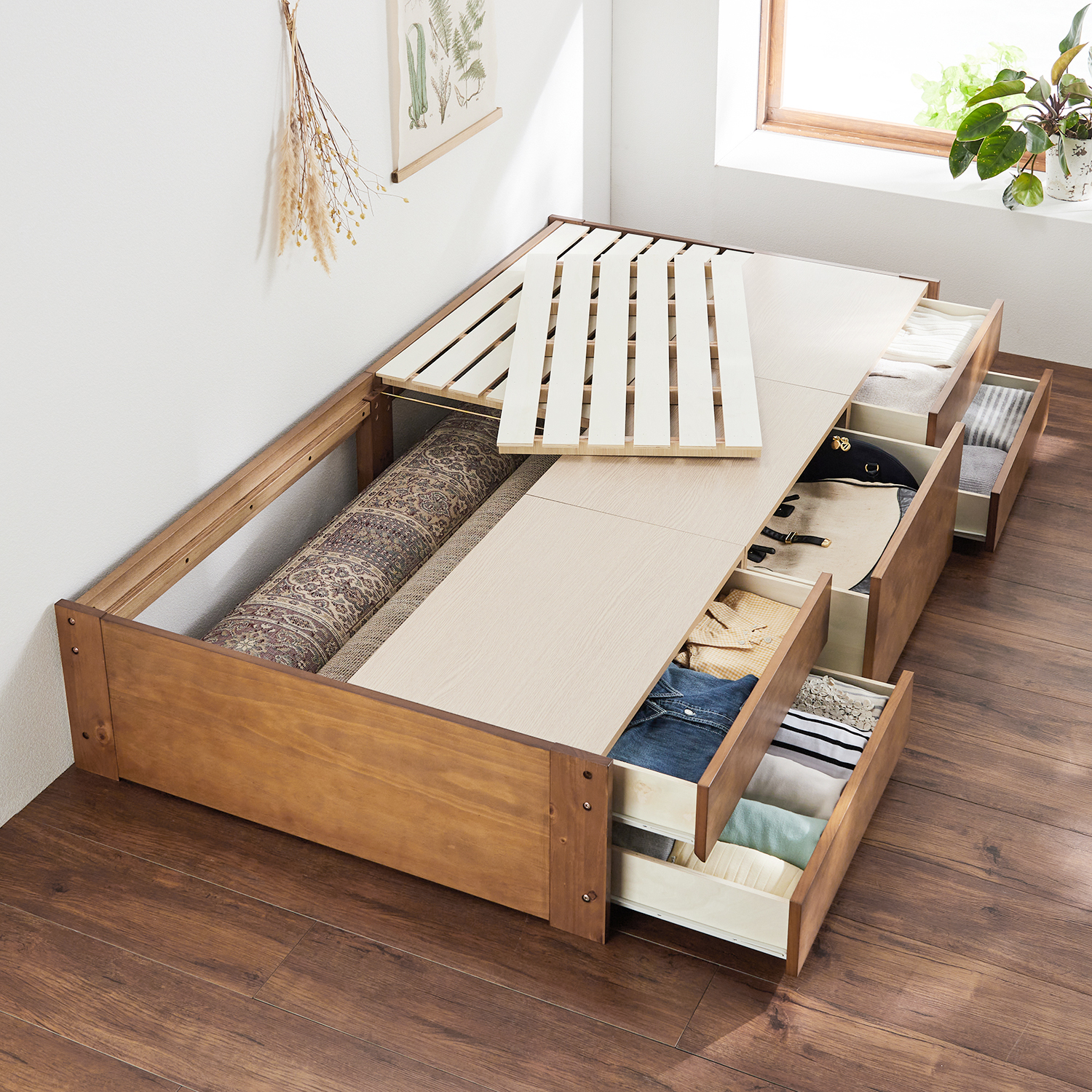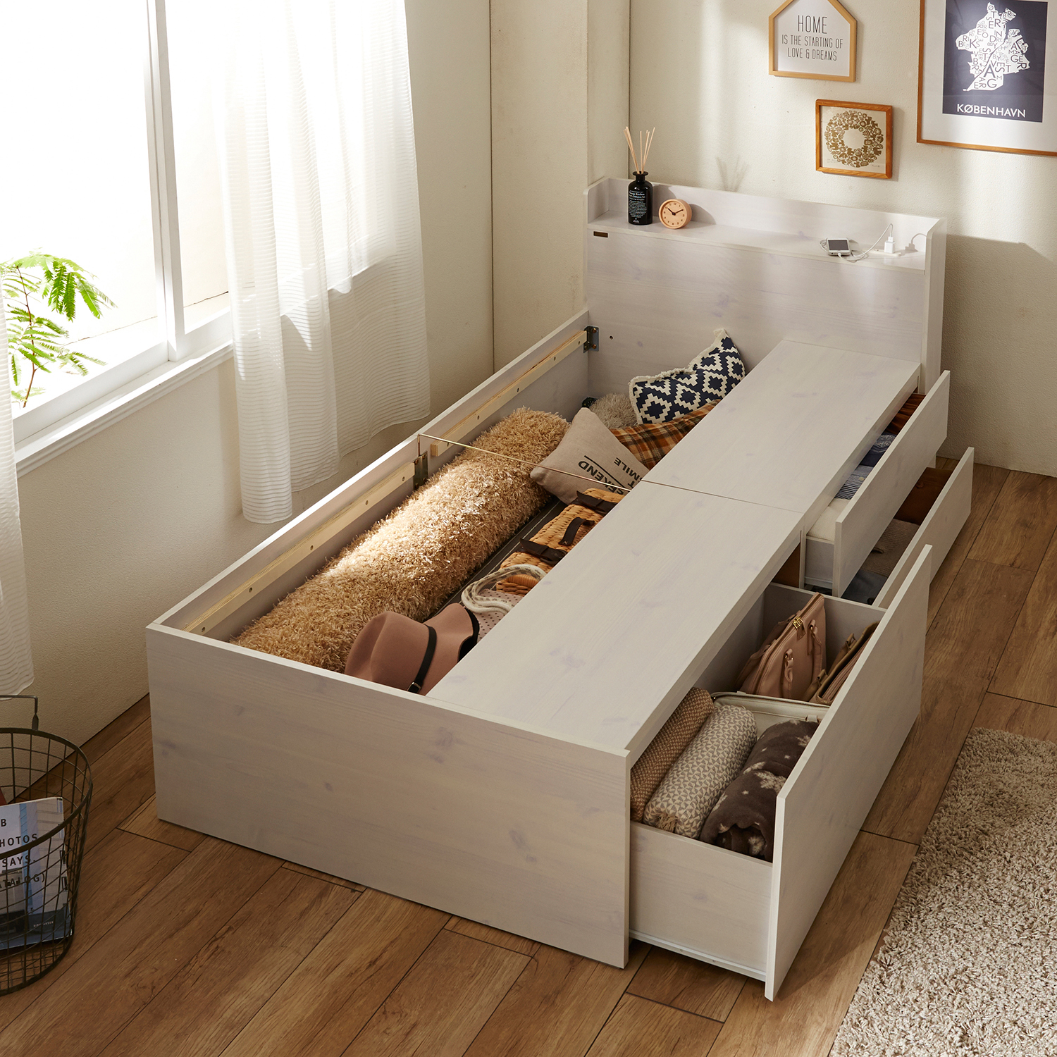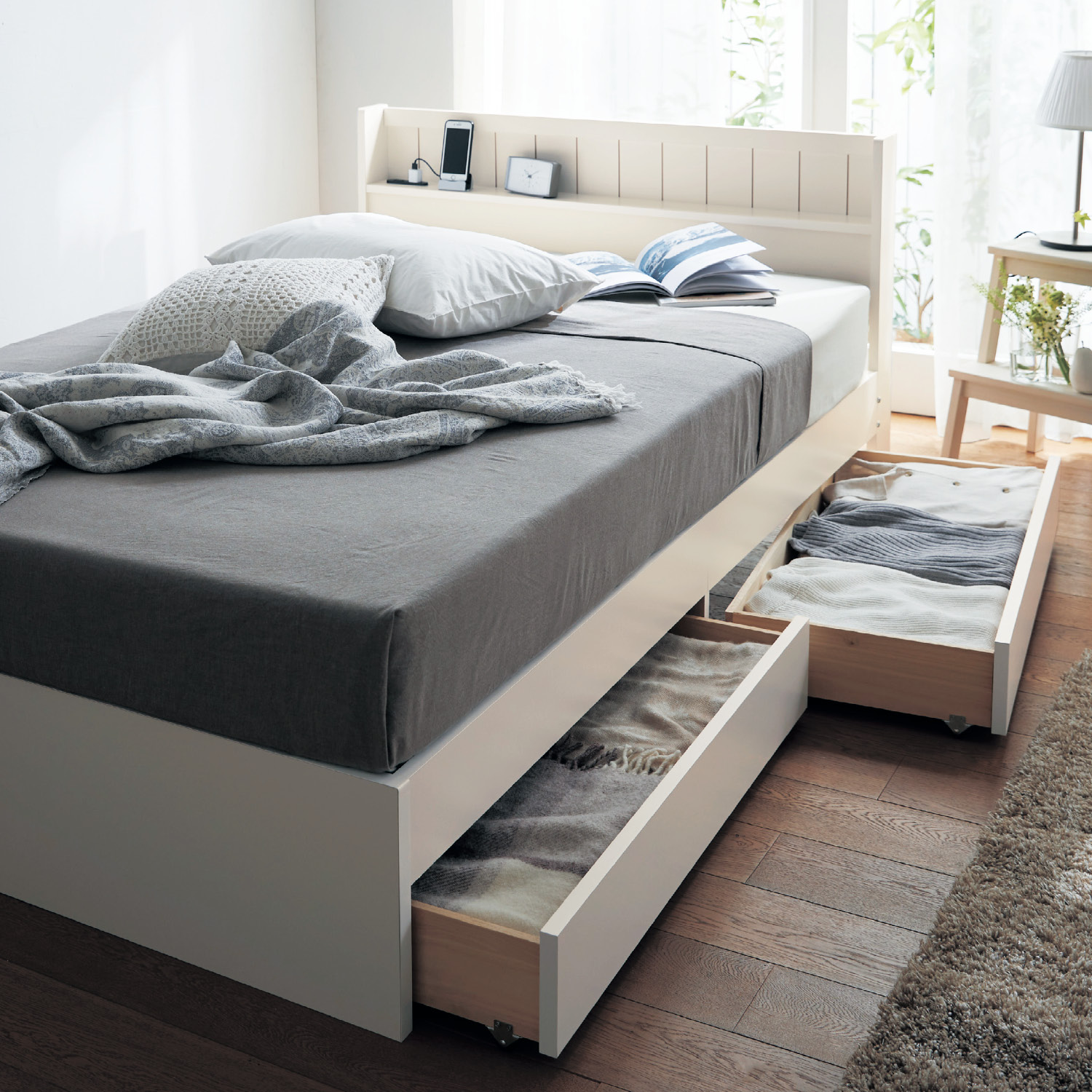 ベッドまわりがすっきり片付く 収納 ベッド。ベッド下スペースを無駄なく有効活用。すっきりと片付いた寝室空間を叶えます。