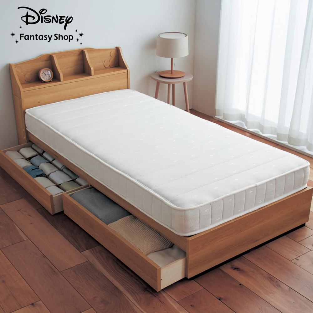| ) | 【ディズニー/Disney】飾り棚付き収納ベッド「ミッキーモチーフ」 立体的なミッキーモチーフがアクセント。ヘッドボードに時計や本、ぬいぐるみを飾って置ける。「マットレス付き」と「マットレスなし」の2タイプ。2杯の引出し付きで収納に便利。引出しはお部屋の配置に合わせて、好みの向きで使用可能。 税込 32,800〜44,900円 |