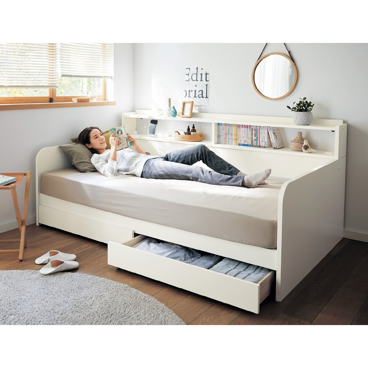 | ) | 【ベルメゾン】収納力が豊富なソファーにもなるすのこベッド[日本製] ソファーとベッド。2通りの使い方ができるデイベッド。スペースがなくてもベッドもソファーも置きたい人にオススメ。2段備えた棚部には、よく使う小物や雑貨をディスプレイしながら置けて便利。左右にコンセントが付いているので、スマホの充電もバッチリ。 税込 73,900円 |