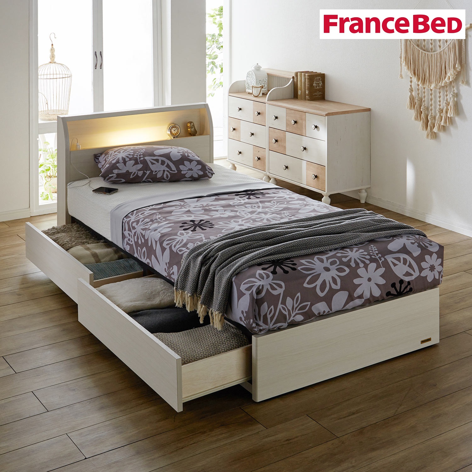 | ) | 【フランスベッド】LED照明コンセント付き引出し収納ベッド 棚とコンセントが付いていて、スマートフォンを充電できます。LEDライトで間接照明のような穏やかな明かりが楽しめます。ヘッドボード部はきれいな木目調シートを使用。背面はきれいに化粧仕上げされています。引出しにはスライドレール付きで、軽く引き出せます。 税込 71,500円 |