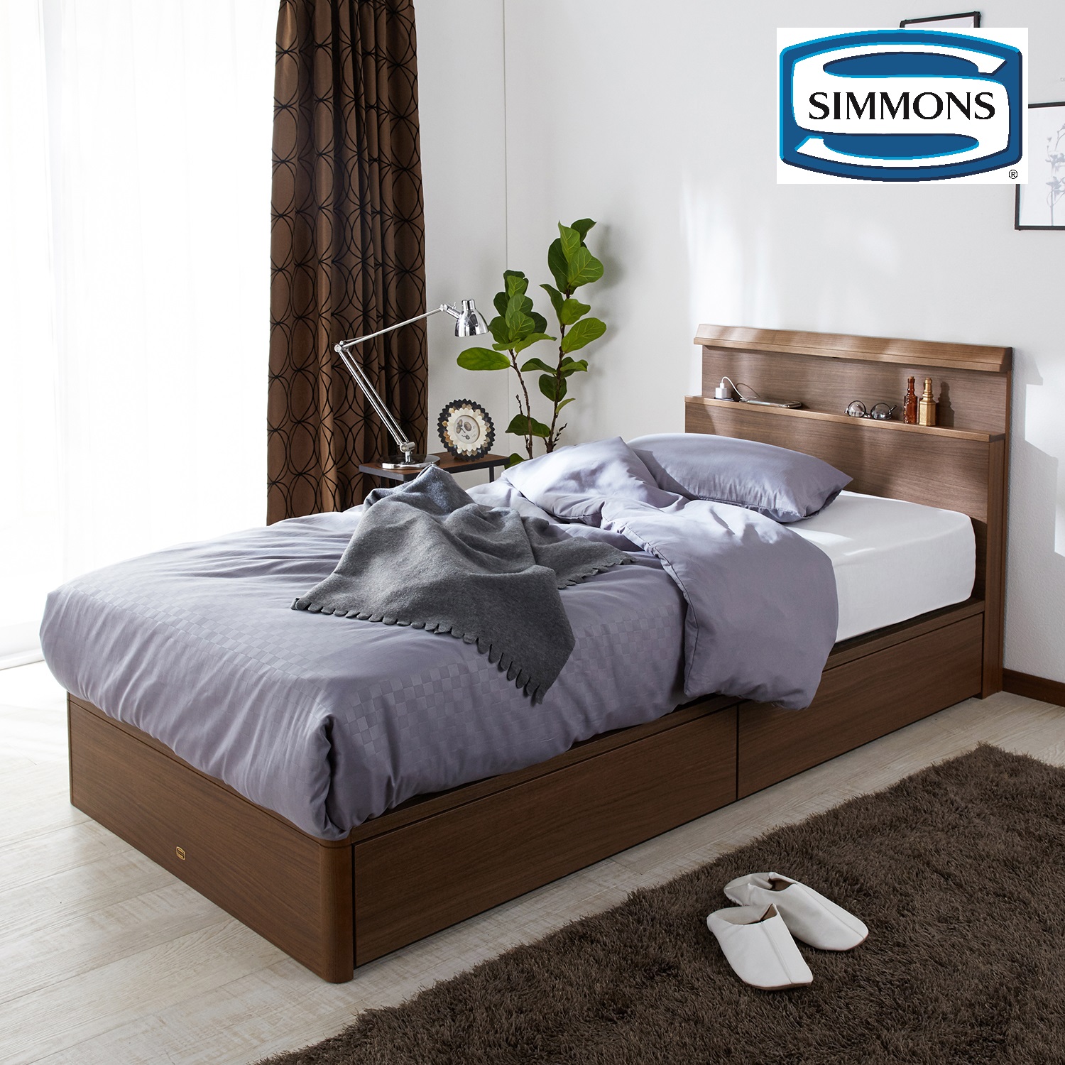 | ) | 【シモンズ/Simmons】LED照明・コンセント付き引出し収納付きベッド(シェルフスリム) ヘッドボード上部と棚部にホワイトアッシュの無垢材を贅沢に使用しました。ヘッドボード部にはLEDライト・コンセント付き。ヘッドボードはコンパクトながら雑誌やタブレットが立てかけられます。床板は通気性のよいすのこ仕様。 税込 118,800〜157,300円 |