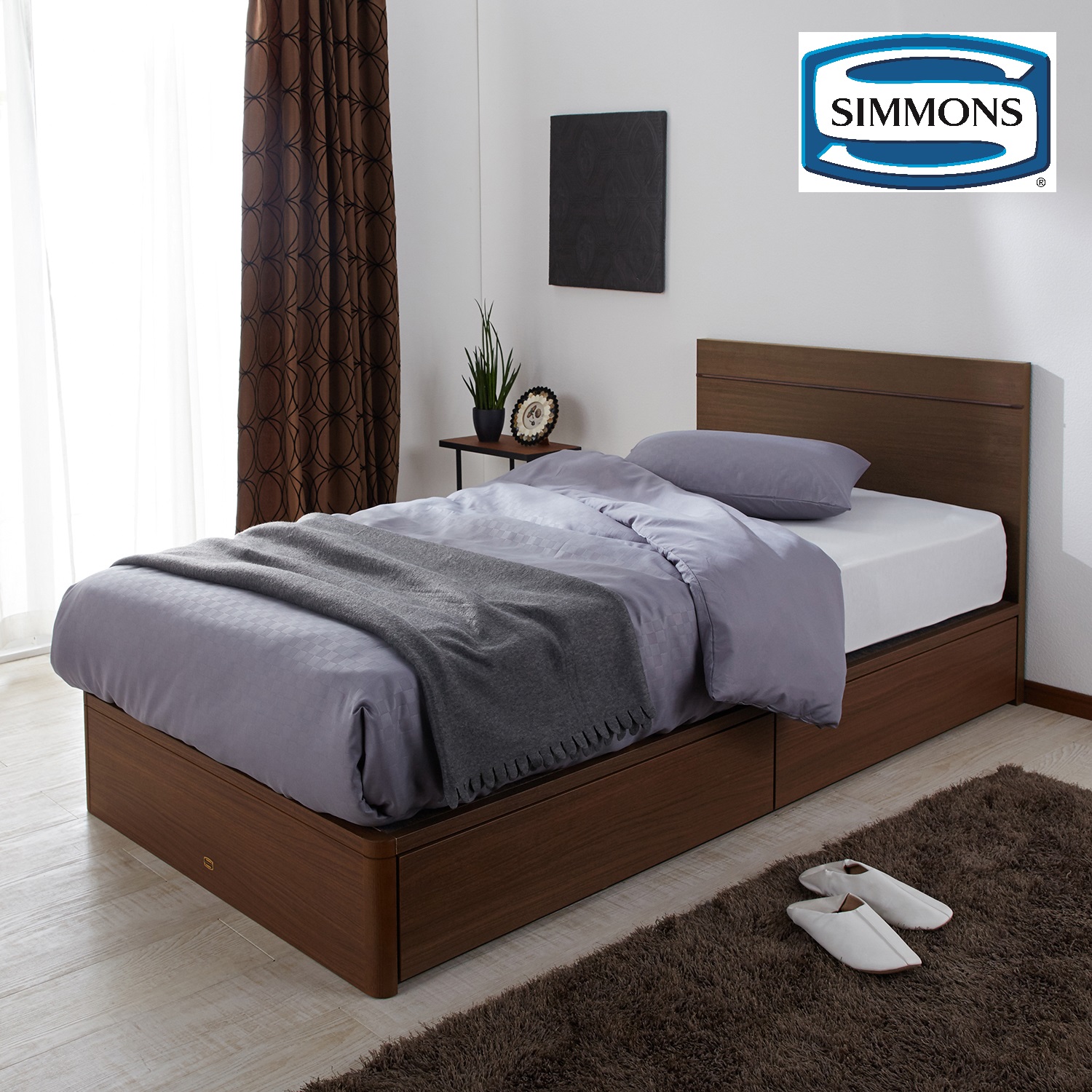 | ) | 【シモンズ/Simmons】引出し収納付きシンプルベッド(フラット2)(本体のみ) シンプルなデザインが一日の疲れを優しく癒してくれるシモンズのベッド。ヘッドボード部にはウォルナット材のラインでアクセントを効かせました。床板は通気性のよいすのこ仕様。 税込 91,300〜129,800円 |