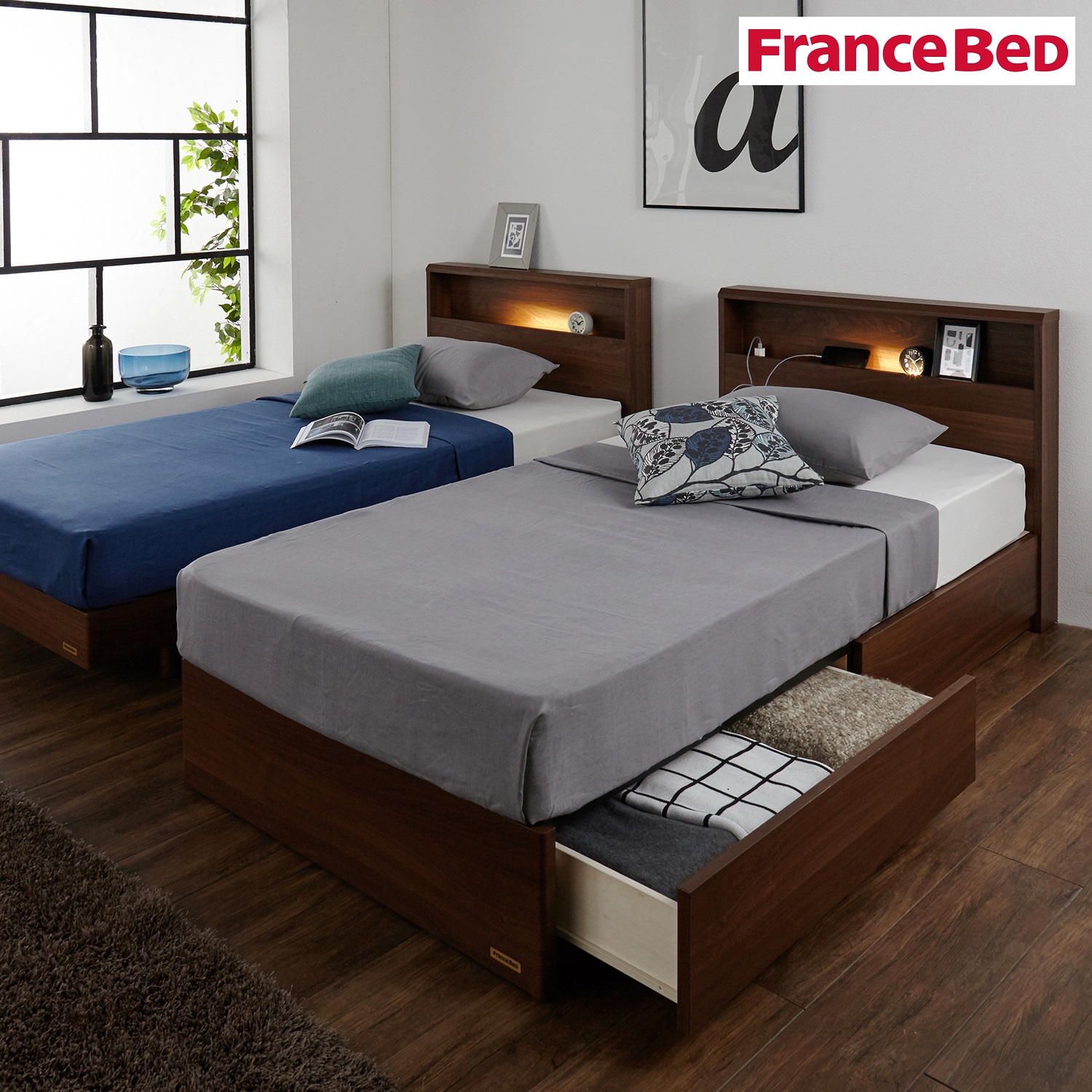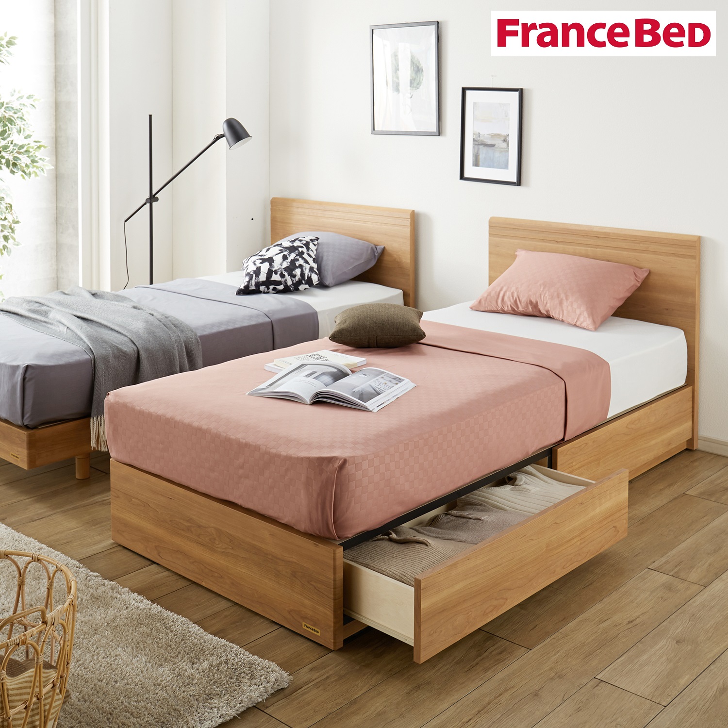 | ) | 【フランスベッド】引出し収納付きシンプルベッド(シングル/セミダブル/ダブル) 木目調のナチュラルなヘッドボードに潔く走るシルバー色のラインが、寝室に落ち着きのあるモダンな雰囲気をプラスするシンプルベッド。フルスライドレール付きでたっぷり収納できる2杯の引出しが便利。また、床下にはラグやスノボなどの長尺ものを収納することもできます。 税込 69,900〜80,900円 |