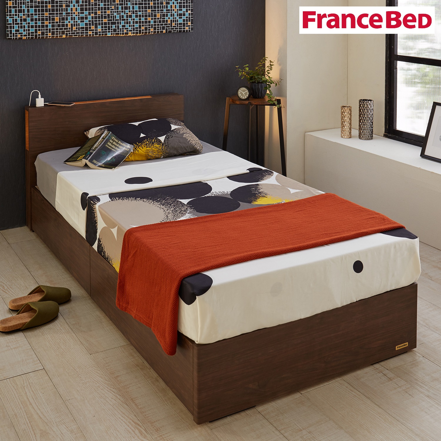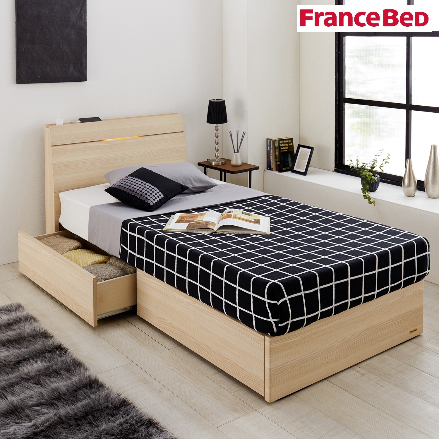 | ) | 【フランスベッド】コンセント・照明付き!引出し収納付きすのこベッド スタイリッシュなデザインが魅力のスクエアなヘッドボードにコンセントと照明が付いた使い勝手抜群のベッド。フレームは、ナチュラルな木目調でシンプルに。奥行約12cmの省スペースタイプの宮には、照明とコンセント1口付きです。 税込 89,100〜105,600円 |
