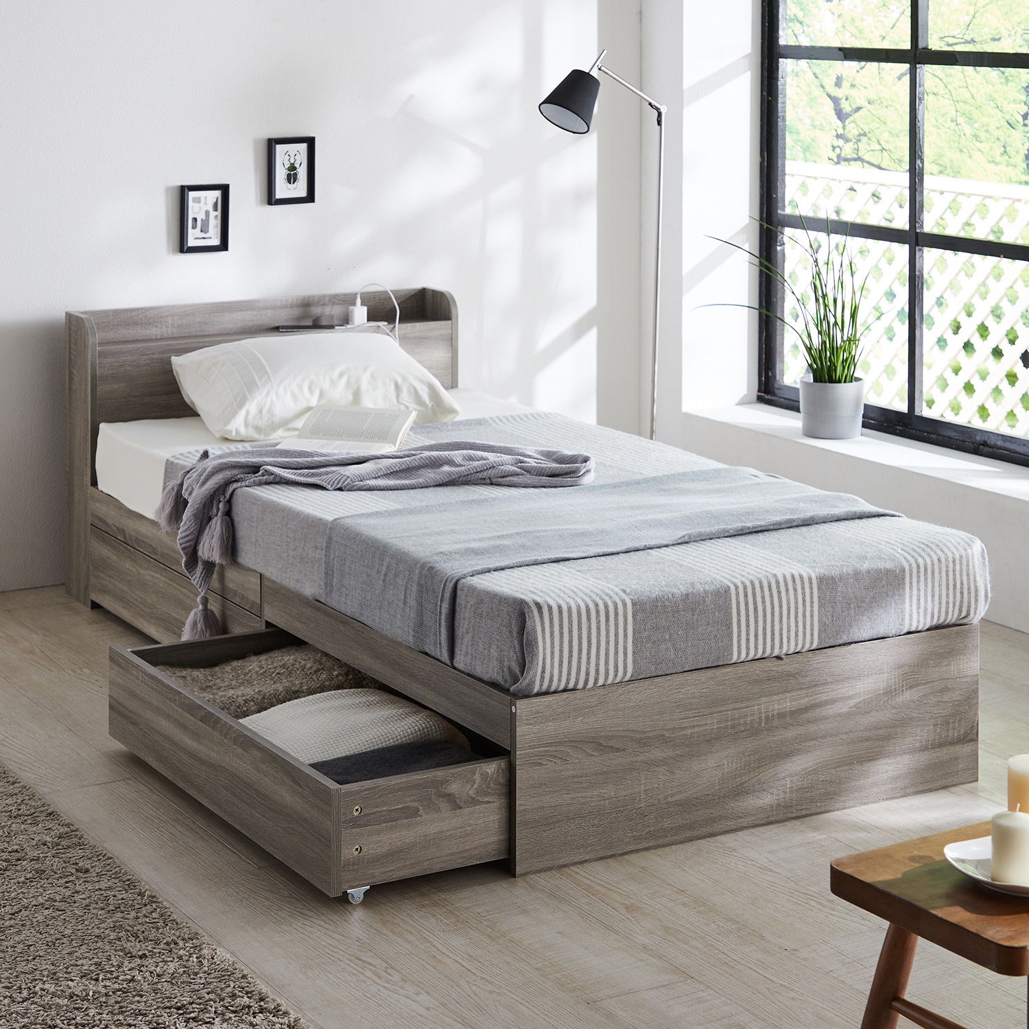 | ) | 【ベルメゾン】豊富なサイズから選べるコンセント&引出し収納付きベッド 日々の物から季節物までたっぷり収納したい人にオススメ!引出し2杯&床面下に収納スペースを備えた、大容量収納が叶うシンプルベッド。キャリーケースやオフシーズンの布団、衣類の収納にお困りの方にぴったり。 税込 34,900〜44,900円 |