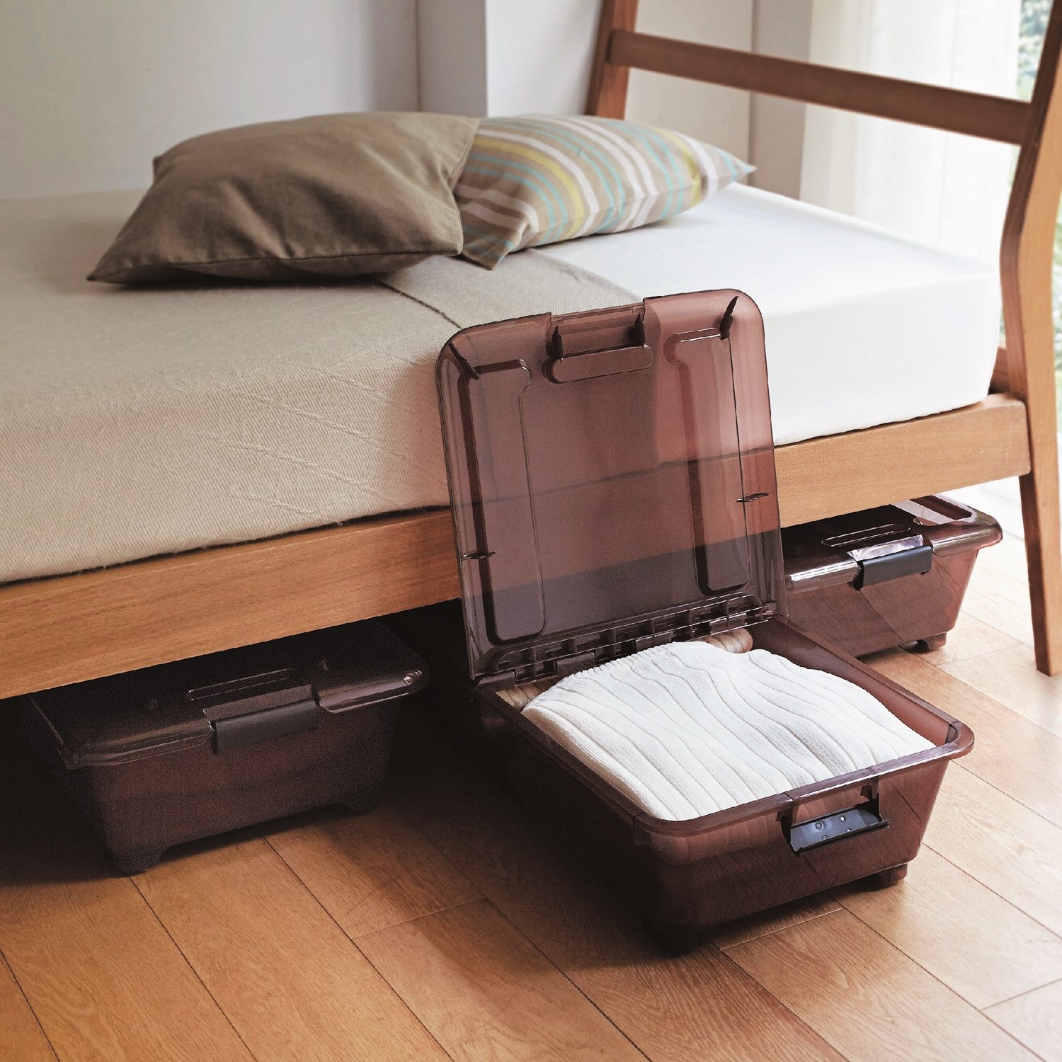 【ベルメゾン】ベッド下収納ケース同色2個セット・4個セット 隠しキャスターと、半面ずつ開けられる中折れ仕様のフタで出し入れスムーズ。ベッド下を有効活用できます。シックなダークブラウンと透明で中身がわかるクリアの2色。 税込 4,990〜8,990円 |
