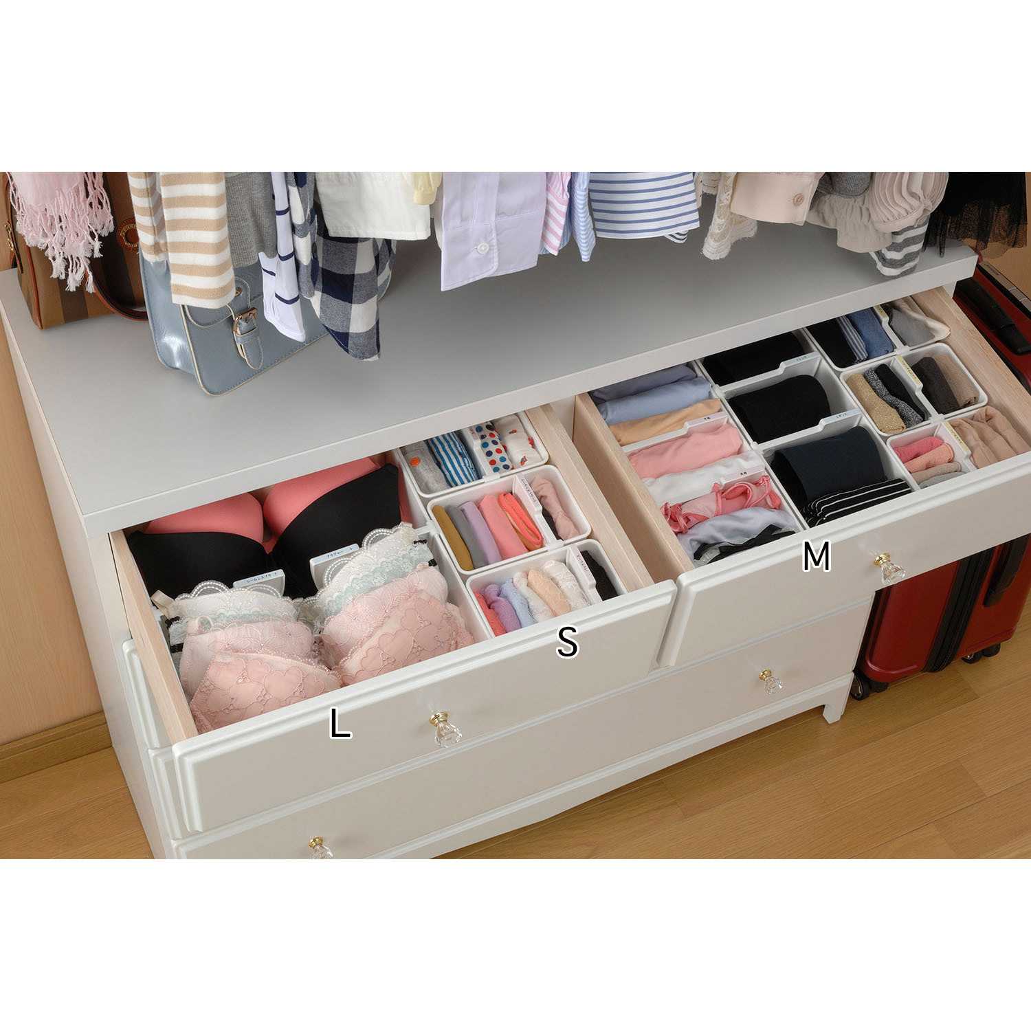 【ベルメゾン】お片付けコンシェルジュ監修の下着収納ケース(単品) ショーツや靴下などをしまうのに便利な「S」サイズのみ2個セットでお届けします。キャミソールなどのインナーの収納にオススメな「M」サイズ。ブラジャーやカップ付きインナーなど型崩れさせたくない下着収納に重宝する「L」サイズ。 税込 715〜1,210円 |