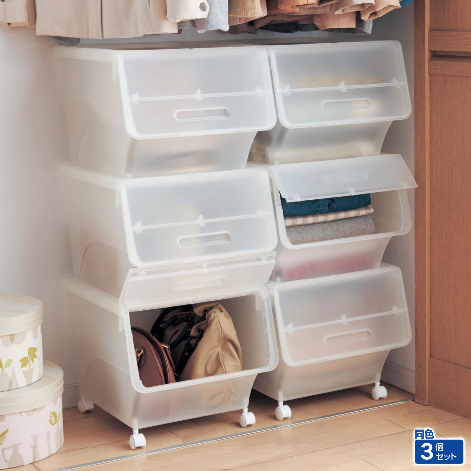 【ベルメゾン】移動させやすいスタッキングクローゼット収納コンテナケースセット 中身が見やすいから探しやすい!。奥行54cmの収納ケースはクローゼットにぴったり。しっかり閉められてホコリも防ぐコンテナタイプは使い勝手抜群。スタッキング可能。底面コロ付きで出し入れ&移動もラクラク。 税込 5,490〜8,990円 |