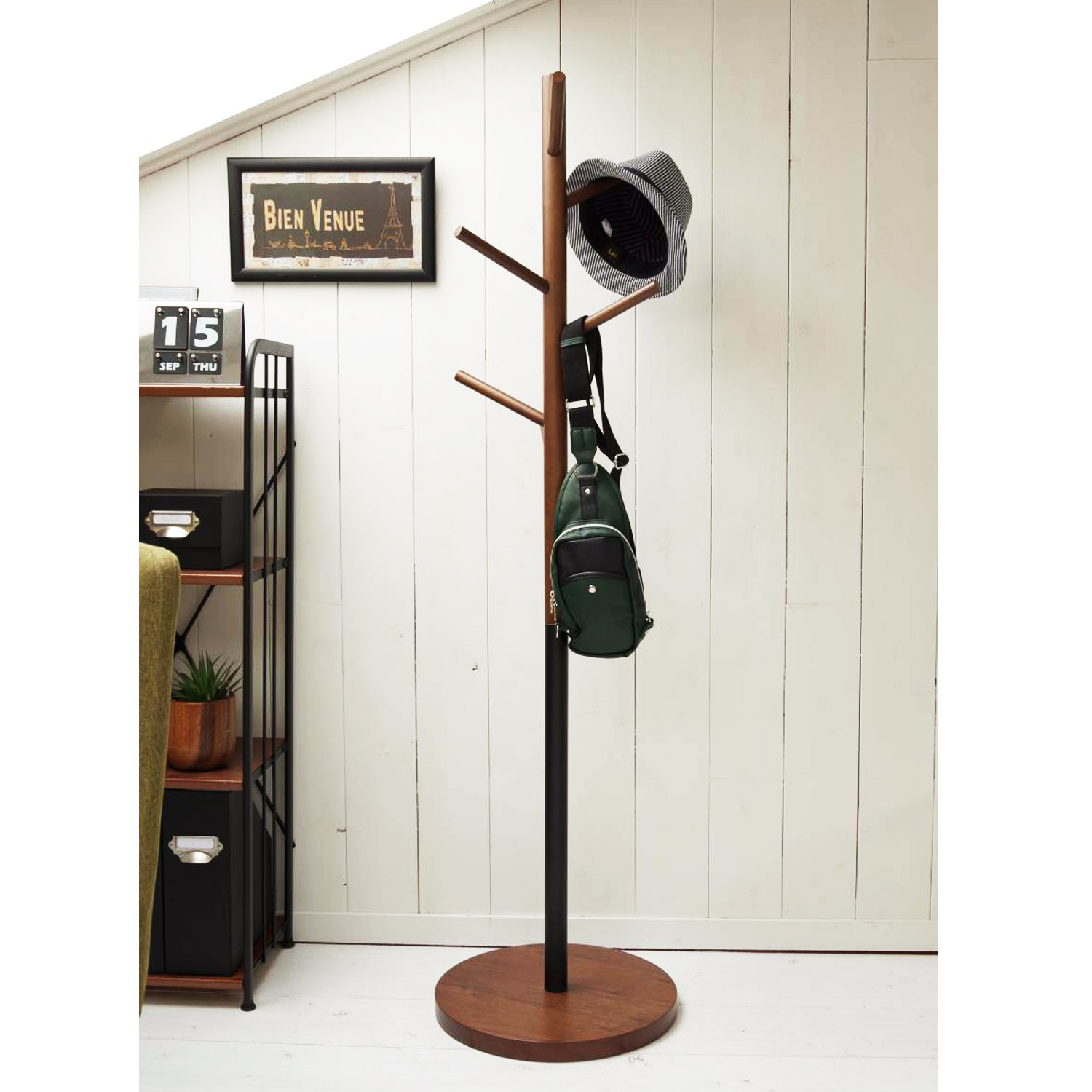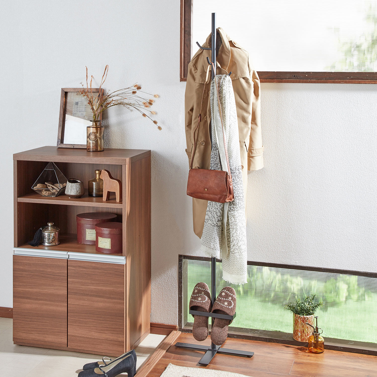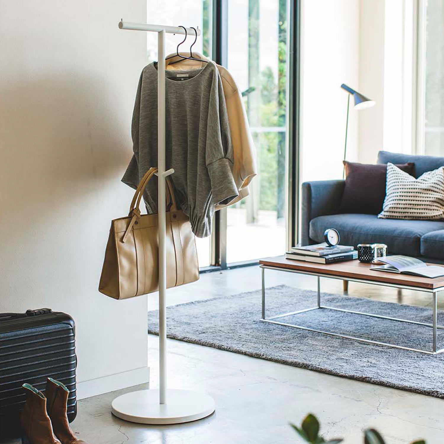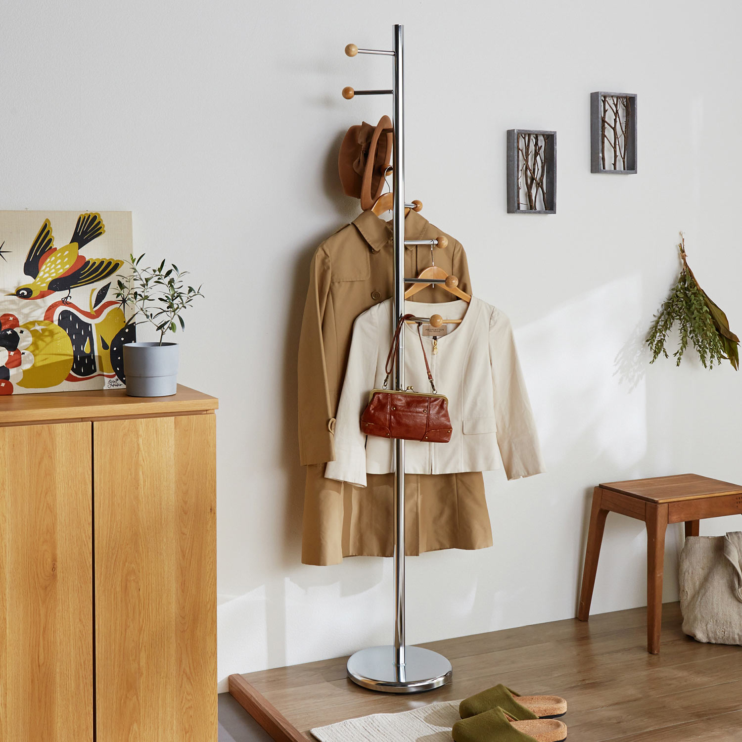 コートや帽子、バッグをポール ハンガーでおしゃれにひとまとめ。帰宅時や来客時に服やバッグをちょい掛けするのにも便利。