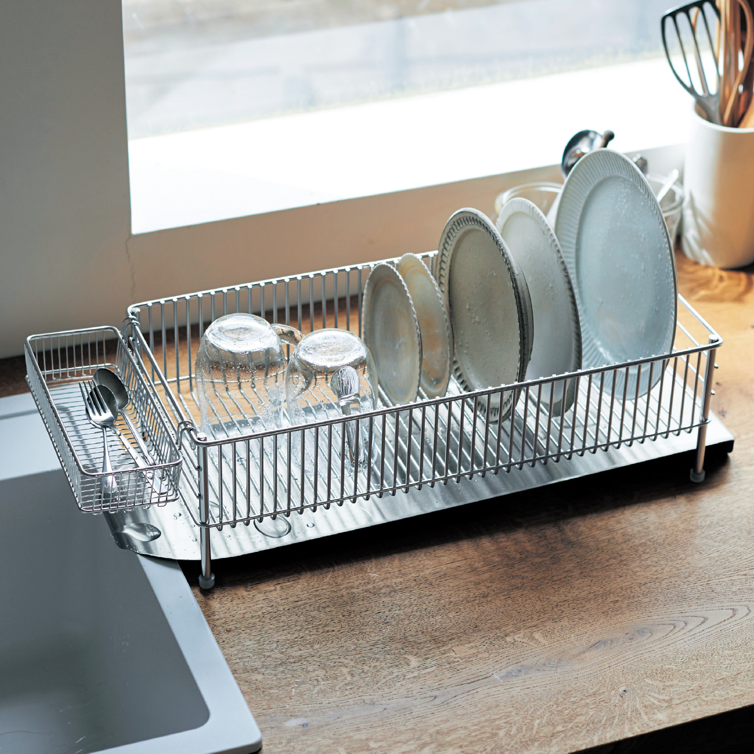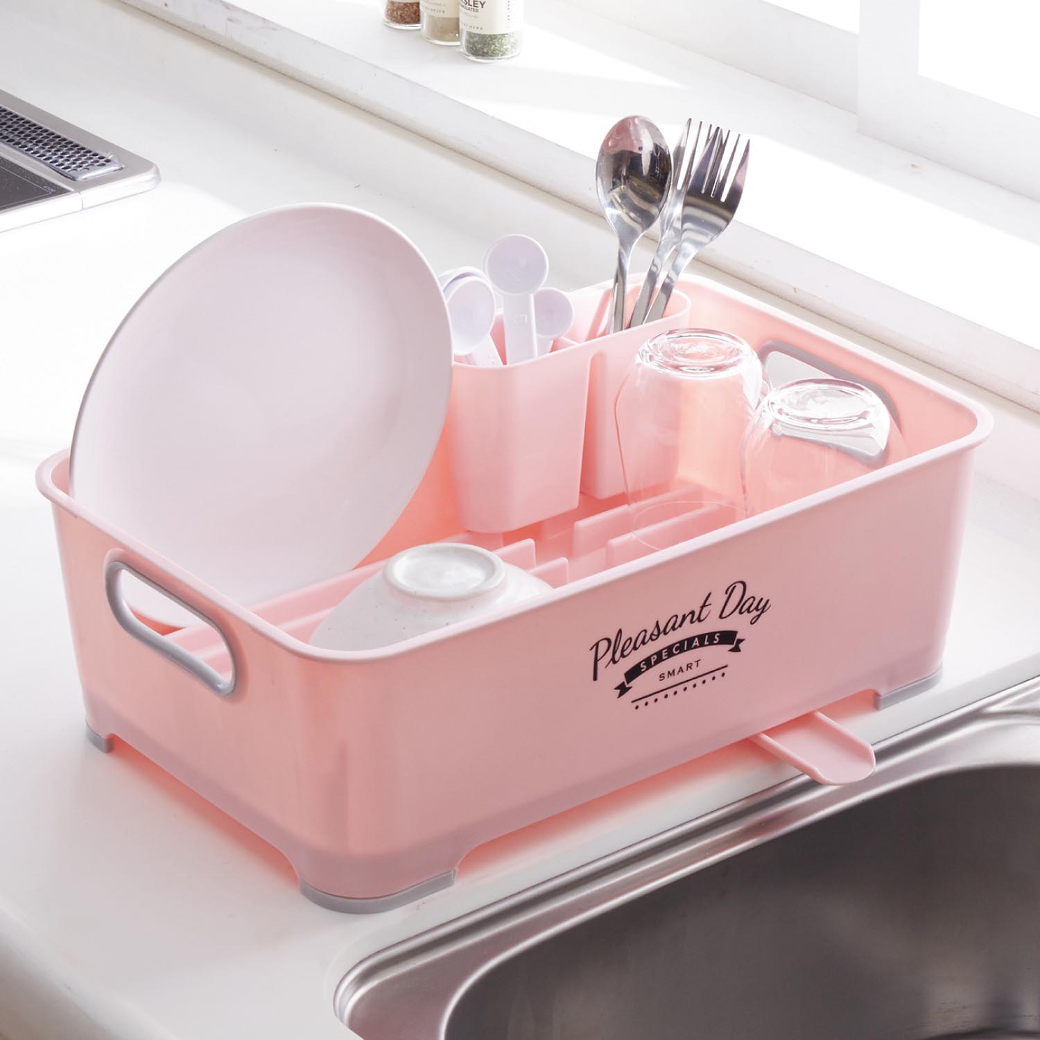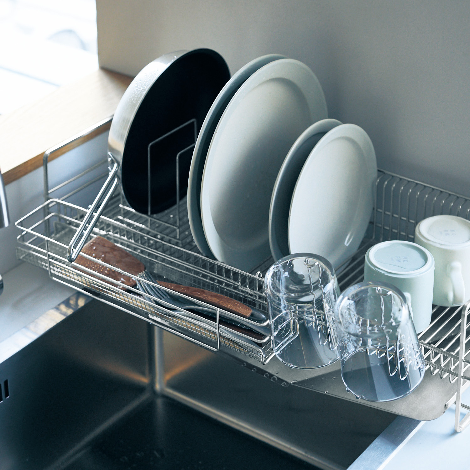 【ベルメゾン】エンボス加工でトレーに汚れがたまりにくい水切りかご よく使うグラスホルダーは6連あり、たっぷり掛けられます。グラスホルダーのあいたスペースには、まな板や鍋蓋などを掛けてもOK。箸ポケットには、箸の先が飛び出さないようパンチング材を使用しました。 ※詳細は画像をクリック※ |