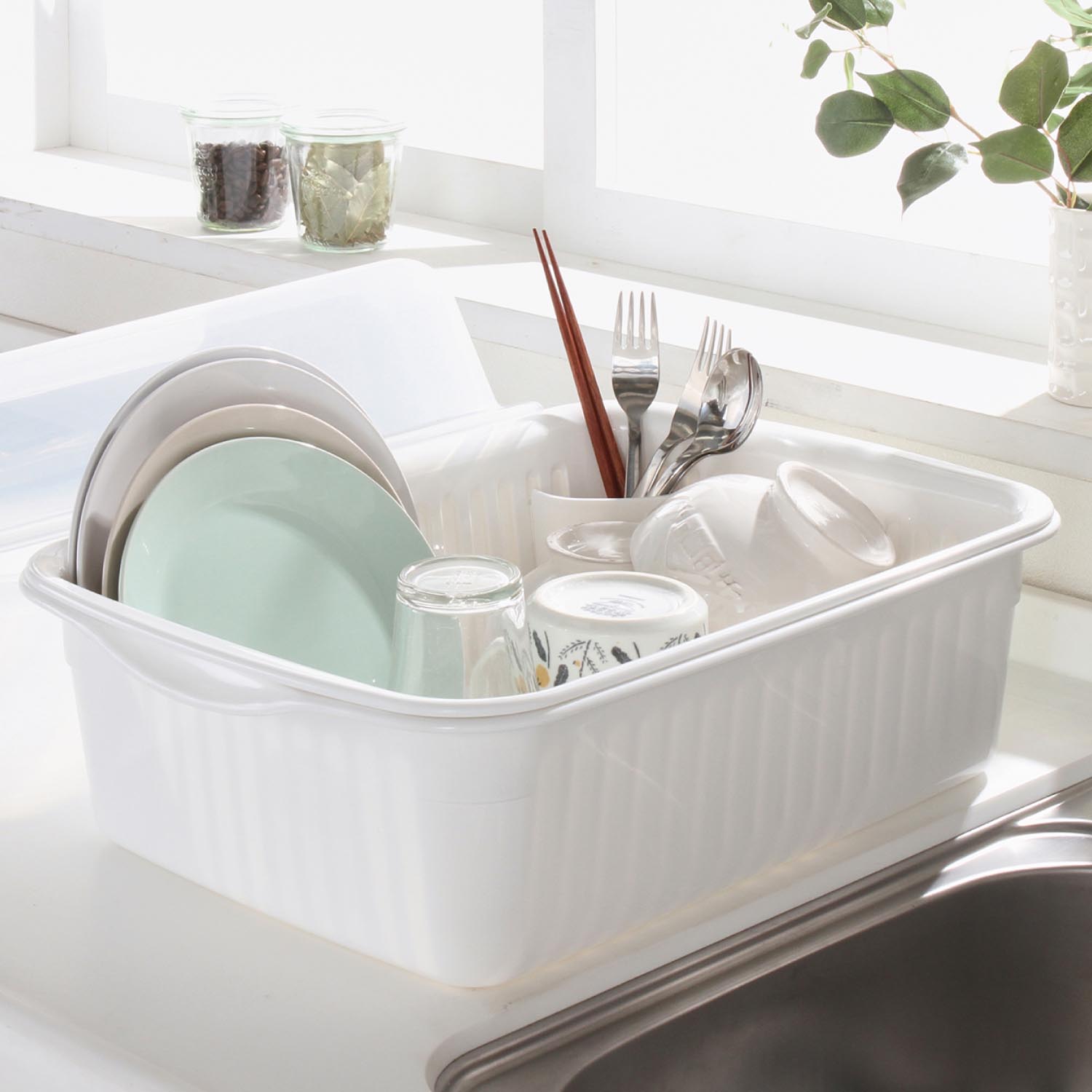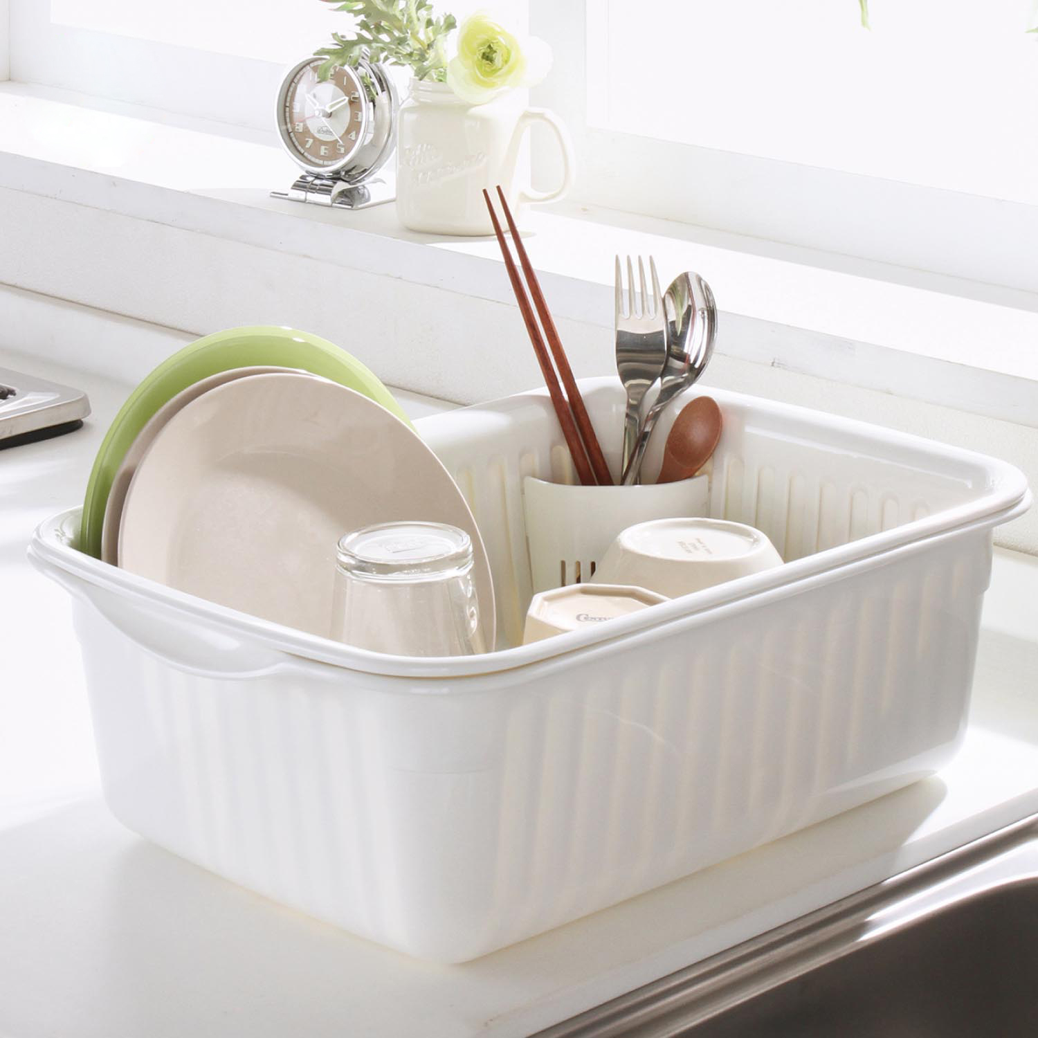 【ベルメゾン】フード付き水切りかご[日本製] セット内容は、本体とバスケット、フードの3点。コーナーには箸入れが付いており、本体には直径21cmのお皿が入ります。水切れがよく、Ag抗菌加工が施されているのもうれしいところ。 ※詳細は画像をクリック※ |