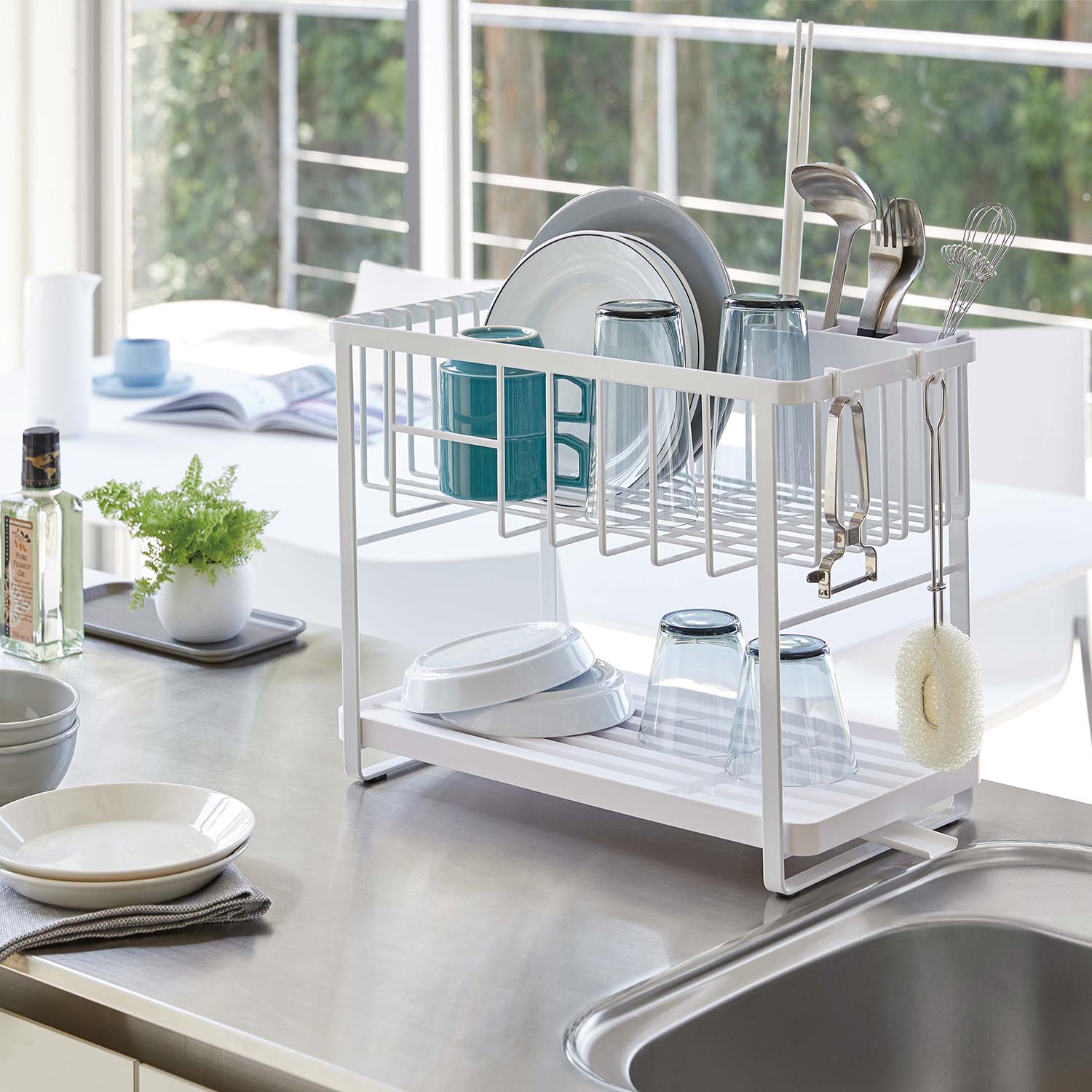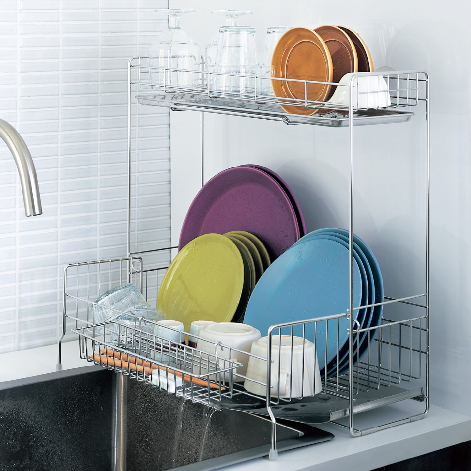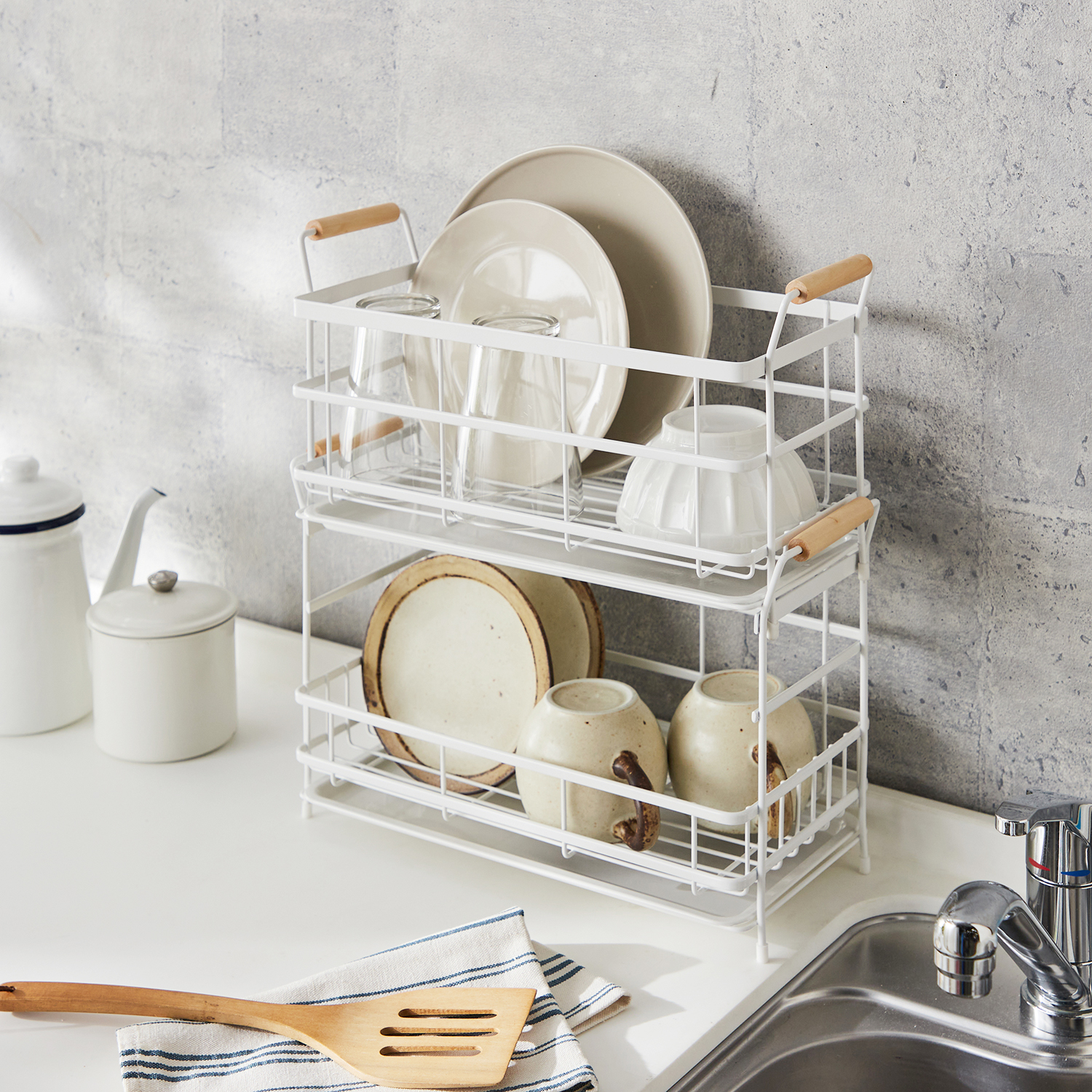 【タワー/tower】2WAY水切りかごワイヤー2段バスケット 【トレイの位置を変えて2WAY】 2段を水切りに使えば、たくさんの食器も乾かせる大容量。上段を水切り棚にして下段のトレーを外せば、調理スペースが広々使えお手入れも簡単。水切りバスケットは皿立て付きで、お皿も立ててすっきり収納できます。 ※詳細は画像をクリック※ |