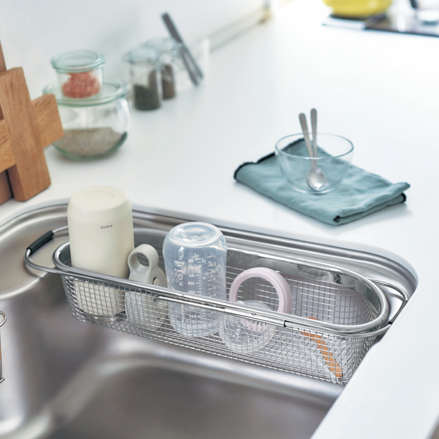 【ベルメゾン】燕三条で作るステンレスメッシュのシンク中水切りかご[日本製] 置く場所に合わせてバーの長さを調整可能。シンク中に設置し、哺乳瓶やお箸、冷水筒のパーツなどの小物を乾かすのにピッタリ。細かいパーツをなくしにくく、スリムサイズのため場所をとりません。 ※詳細は画像をクリック※ |