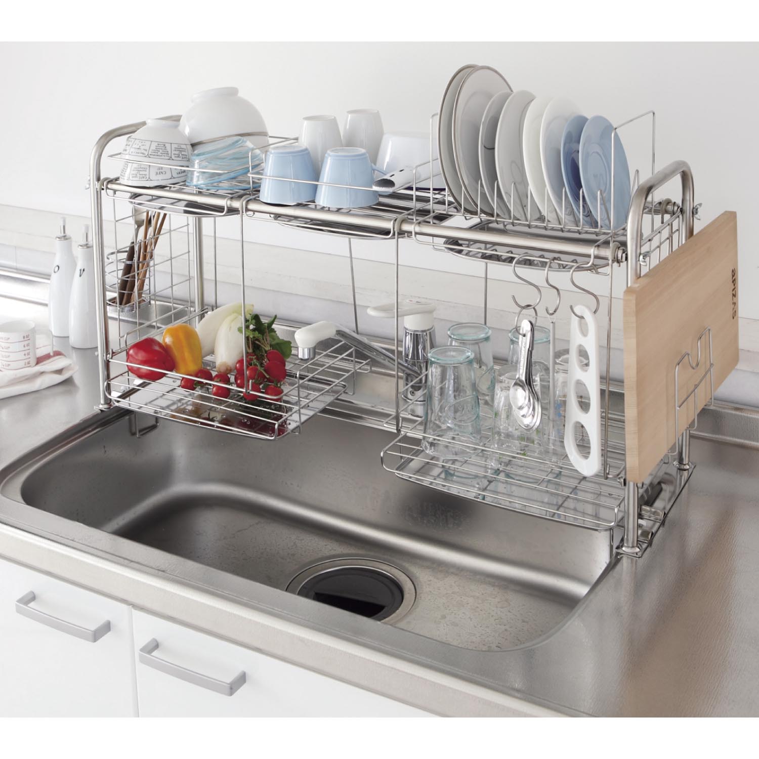 【ベルメゾン】伸縮ステンレス水切りラック[日本製] ご家庭のシンクの大きさに合わせて、幅約66〜104cmまで伸縮できます。ステンレス製のためサビにくく、いつも清潔。大・小の水切りバスケット、皿立て、箸立て、まな板ラック、S字フック3個付き。 ※詳細は画像をクリック※ |