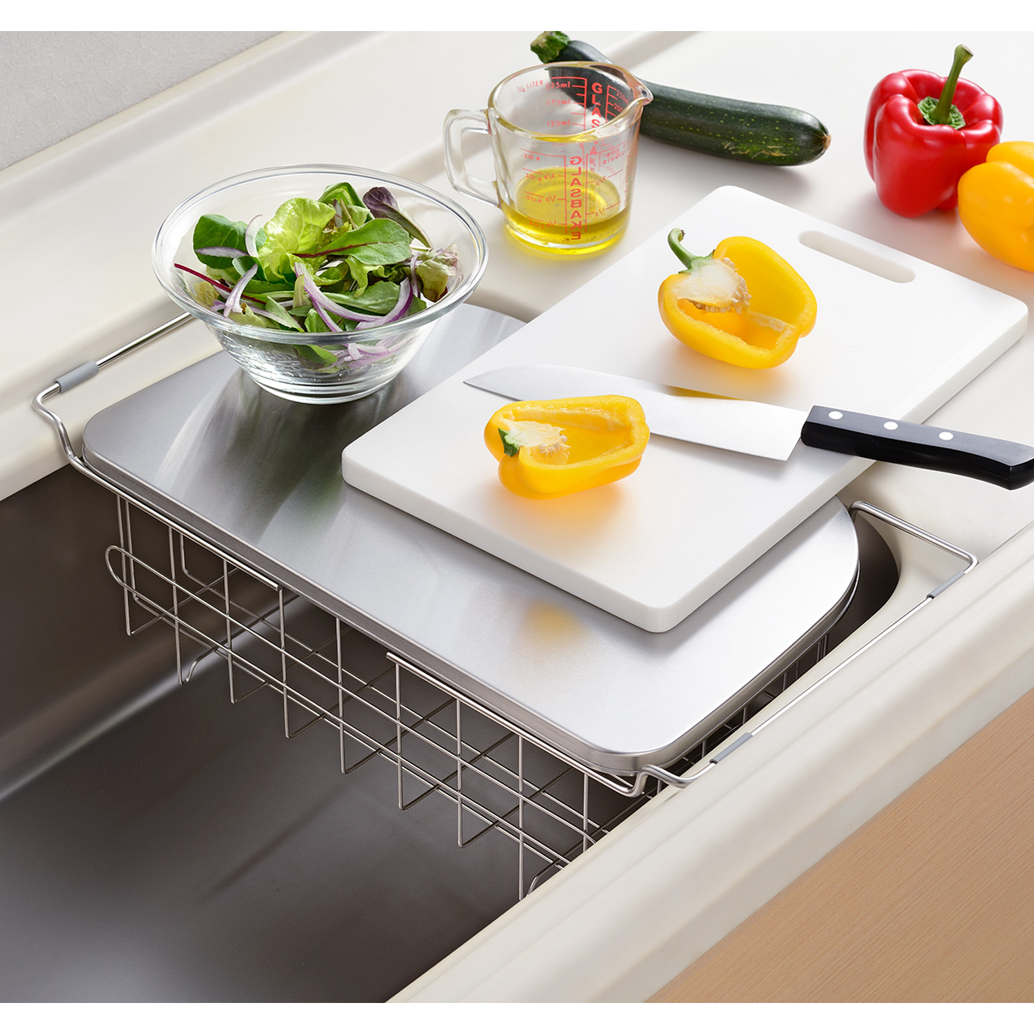 【ベルメゾン】調理スペースが広がるトレー&水切り シンク内に渡して設置し、トレーを外して水切りかごとして使えます。シンク横の天板の上に置いて使う場合は、トレーを下に敷いて水受けに。シンクに渡してトレーを設置すれば、調理スペースが広がって便利。 ※詳細は画像をクリック※ |