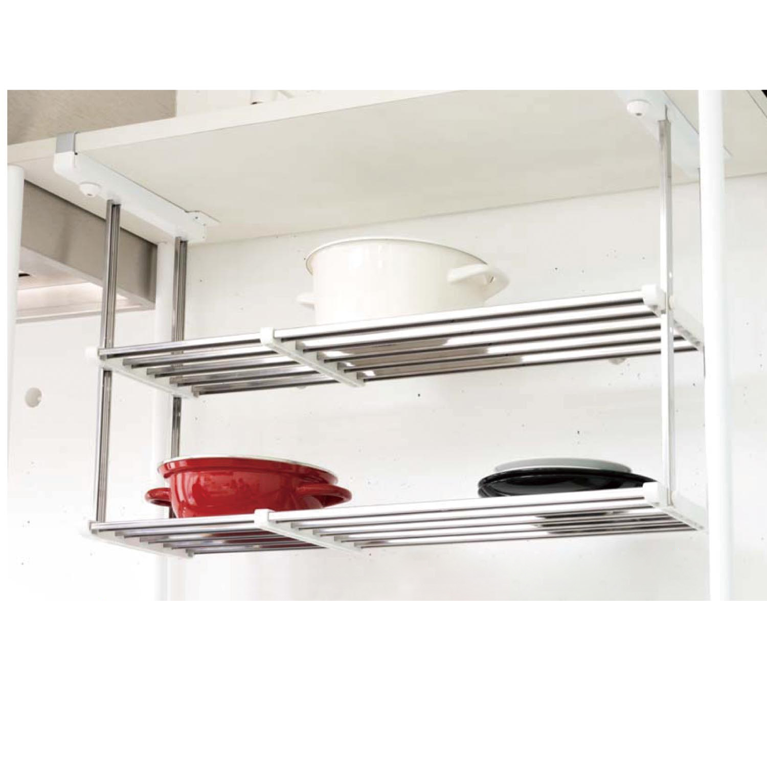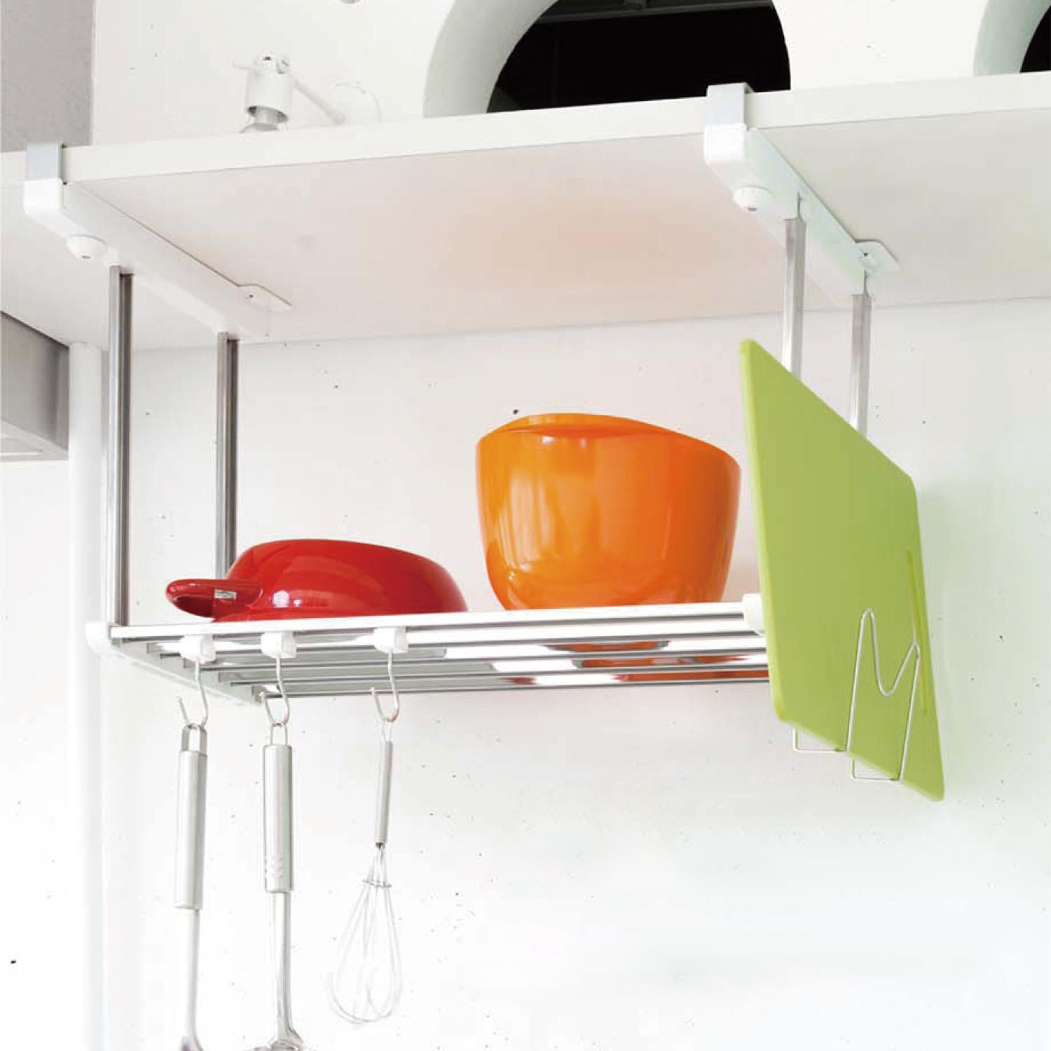 【ベルメゾン】伸縮できる吊り戸棚下収納棚 戸棚の底板を挟むようにして取り付けるだけで、耐荷重約3kgの棚を2段つくることができるアイデア収納。デッドスペースになりがちな吊戸棚の下を有効活用して、キッチンをすっきり片づけられます。幅はスペースに合わせてぴったりサイズで使える約50〜90cmの伸縮タイプ。 ※詳細は画像をクリック※ |