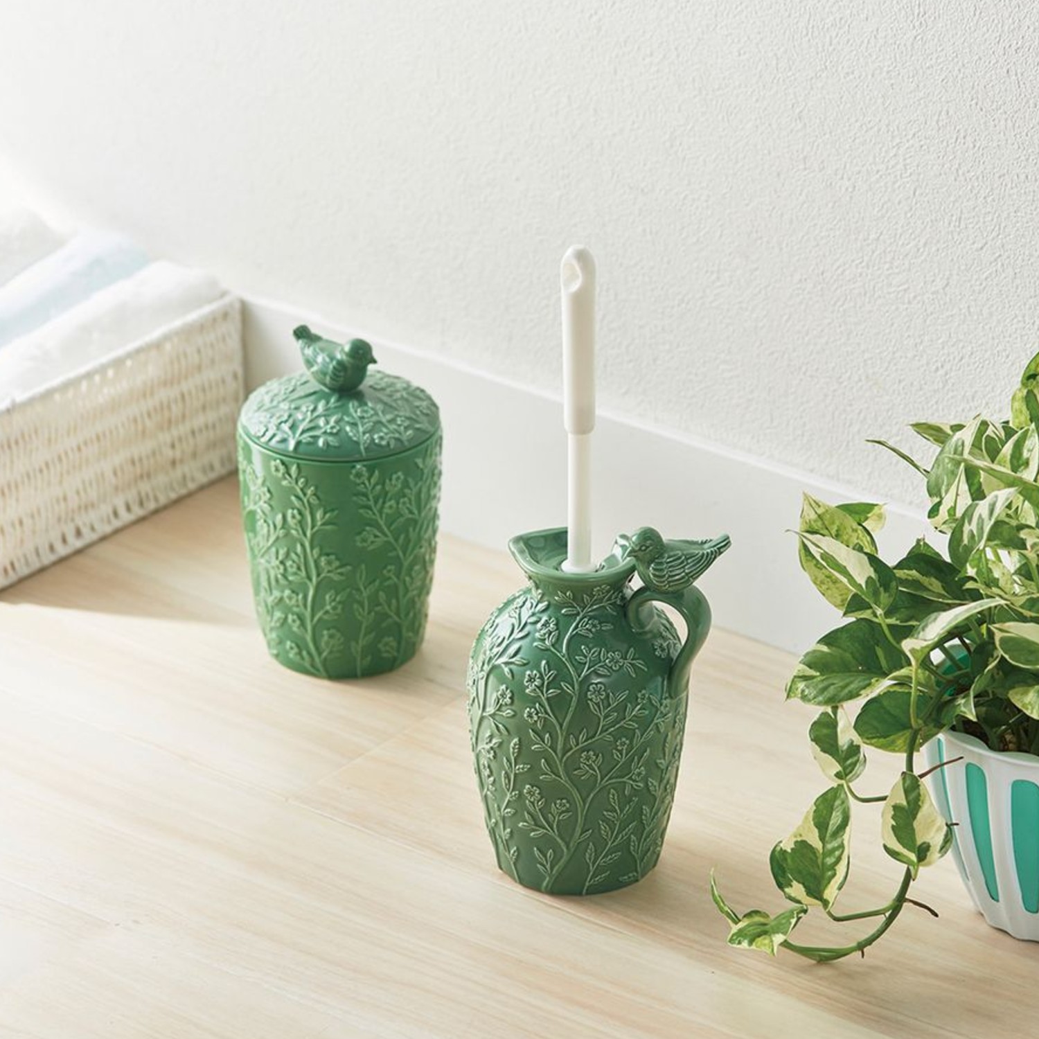 【ベルメゾン】ボタニカルデザインのトイレブラシ&トイレポットセット 生活感が出やすいトイレブラシやポットを、華やぎのあるデザインに♪爽やかなグリーンをベースに、優美なボタニカル柄のレリーフをほどこしました。小鳥がちょこんと乗っている小鳥が、愛らしいアクセントに。 税込 4,950円 |